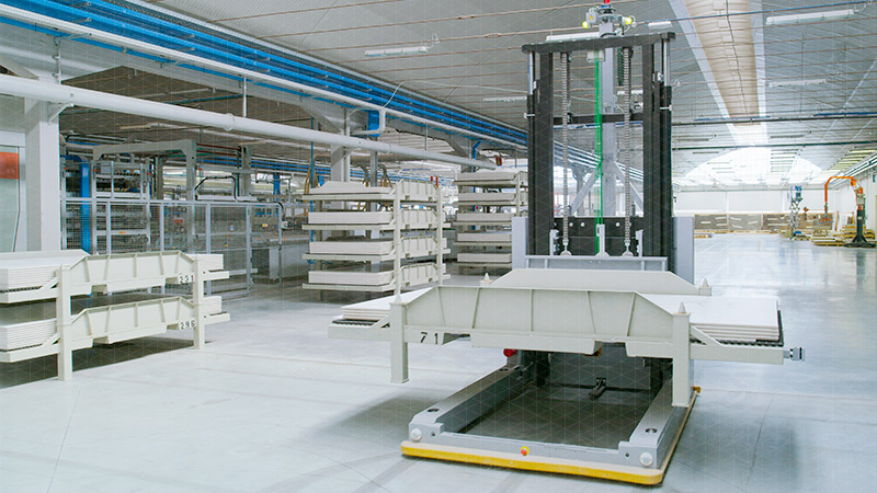 Storage allows production to be organised in batches, facilitating product changeover and increasing ceramic production efficiency. Handling of fired products is done with automatic vehicles. In the case of large size ceramic production, a solution is available with intermediate storage of fired product and the subsequent surface finishing and format cutting, depending on the job order. FEBEX offers a wide range of machines to sort through and package tiles and slabs. Packaging can be with cardboard blanks for medium-small sizes or trays for larger sizes. For the packaging of large slabs, crates or trestles are used.